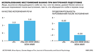 Так, в одном исследовании мы установили, что участники, которые, готовя пятиминутное выступление, мысленно обращались к себе во втором или третьем лице или по имени, были спокойнее и лучше справились с заданием, чем те, кто все время был для себя «я».