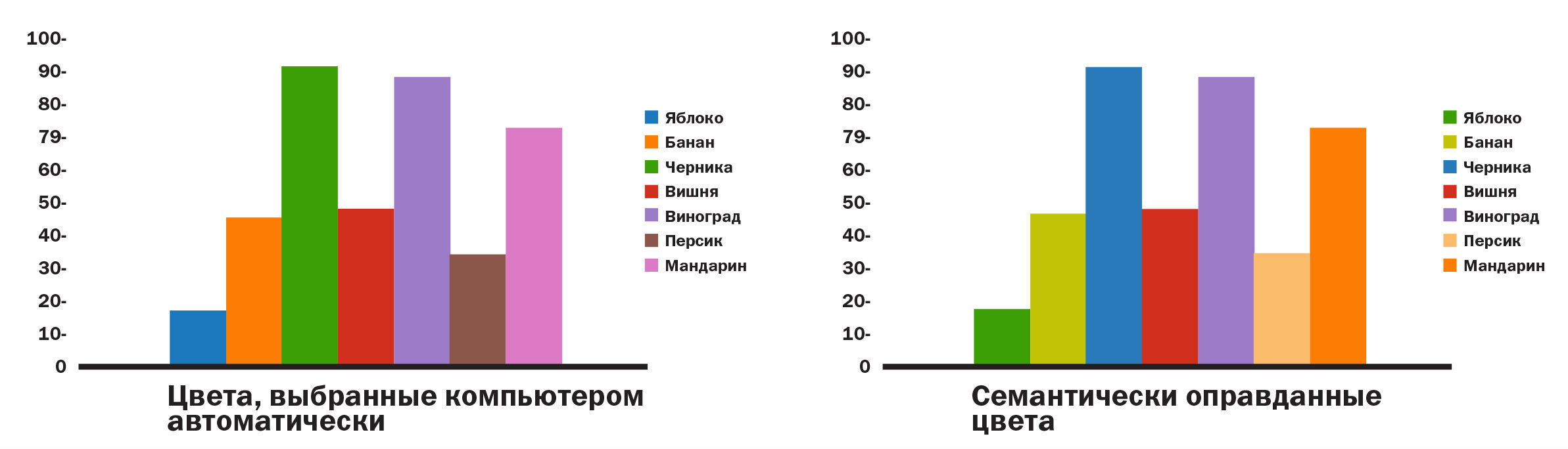 Единственная разница между двумя графиками — выбор цветов. В схеме слева используются цвета, предложенные автоматической палитрой компьютера. В графике справа столбикам были присвоены семантичеки оправданные цвета. (В данном случае присвоение цветов было рассчитано компьютером с помощью алгоритма, который анализирует цвета в релевантных изображениях из Google Image Search. В поиск задавались названия каждой категории графика.)