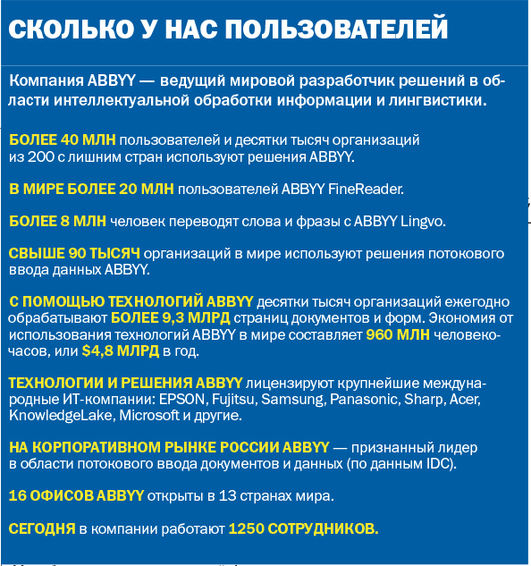 Существенное преимущество ABBYY в том, что мы разрабатываем не просто программы, а базовые технологии, на основе которых можно создавать различные решения. Окрыленные успехом FineReader, мы стали внедрять технологии потокового ввода данных на основе нашего FineReader — в российских компаниях, которые оперируют большими объемами документов. Сегодня ABBYY — лидер на этом рынке в России, а всего в мире наши решения применяют около 90 тысяч коммерческих и государственных структур. Но этот бизнес не состоялся бы, не будь мы такими упертыми.