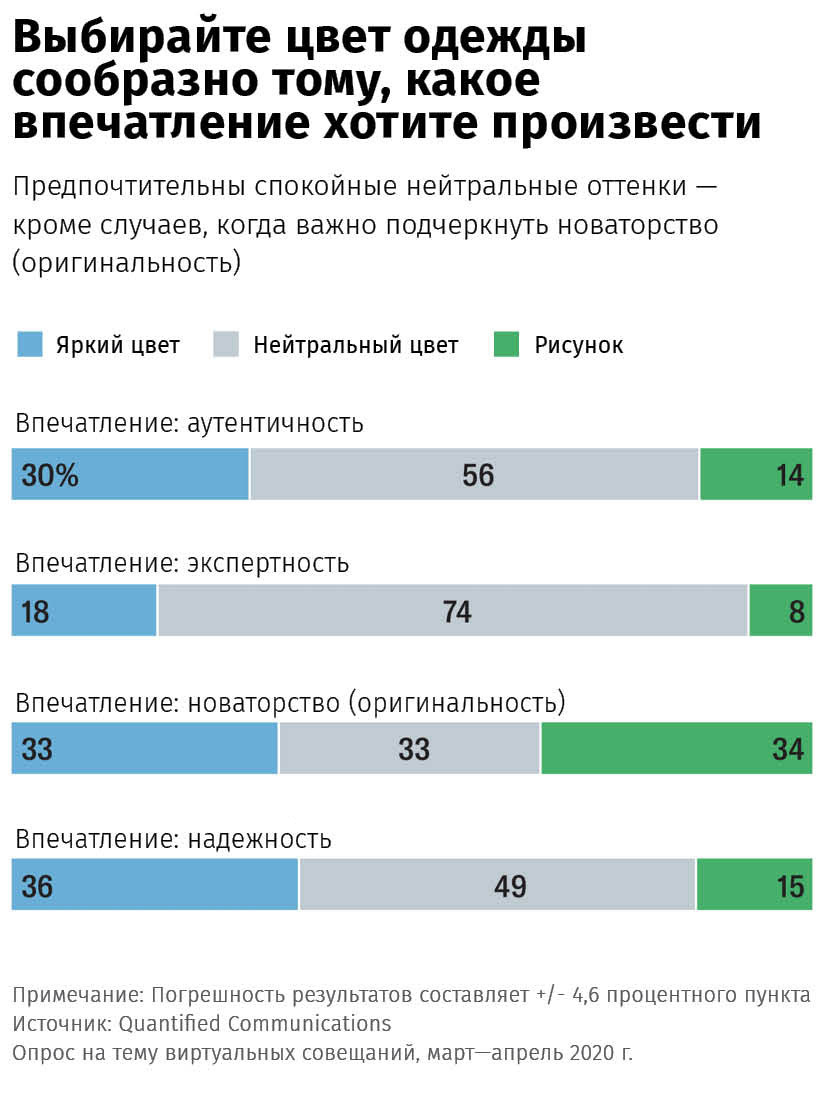 Что касается стиля, чаще всего применительно к трем из четырех рассматриваемых характеристик респонденты выбирали повседневно-деловой стиль. Но если вам предстоит выступить на совещании руководства или пообщаться с новым клиентом, вероятно, вы будете стремиться в первую очередь создать впечатление экспертности. И в этом случае выбирайте формально-деловой стиль и нейтральные цвета, например, костюм (и галстук для мужчин). Поскольку многие специалисты, считающиеся «экспертами» — юристы, банковские служащие, консультанты, — обычно ходят в костюмах, неудивительно, что большинство респондентов ассоциируют с экспертностью именно формально-деловой стиль. И если вы работаете в сфере, где он принят как норма, будет правильно придерживаться того же уровня профессионализма и на виртуальном совещании. Главный вывод: не стоит думать, что если рабочая обстановка изменилась, то и одежда тоже должна измениться.