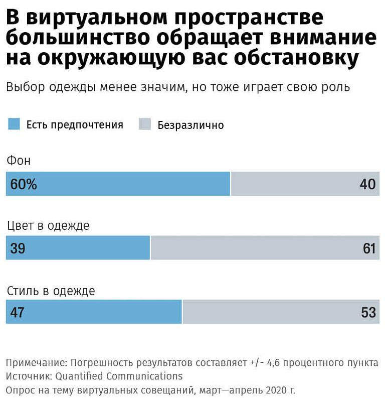 В разрезе данных по половозрастным группам мужская и более молодая аудитория респондентов в целом высказывает более определенные предпочтения. В среднем 54% мужчин (против 43% женщин) точно обозначали свою позицию в отношении фона, выбора цвета и стиля гардероба; в возрастной группе от 18 до 29 лет четкую точку зрения озвучивали 57% участников — против 49% по выборке в целом. Как и в реальном мире, внешнее впечатление имеет значение, и чтобы произвести желаемый эффект, имеет смысл потратить время на выбор правильного визуального окружения и продумать стиль в одежде.