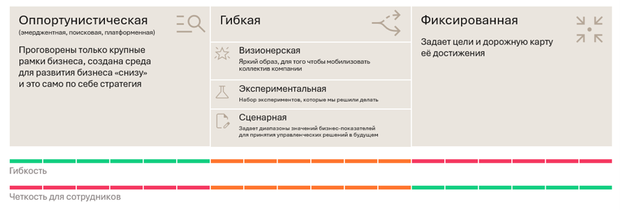 Выделяется три типа гибких стратегий — визионерская, экспериментальная и сценарная. Часто можно увидеть их сочетание, но даже использование одного подхода уже дает многое — гибкость по сравнению с классическими фиксированными стратегиями, существенно большую ясность и нацеленность команды в сравнении с оппортунистическими стратегиями.