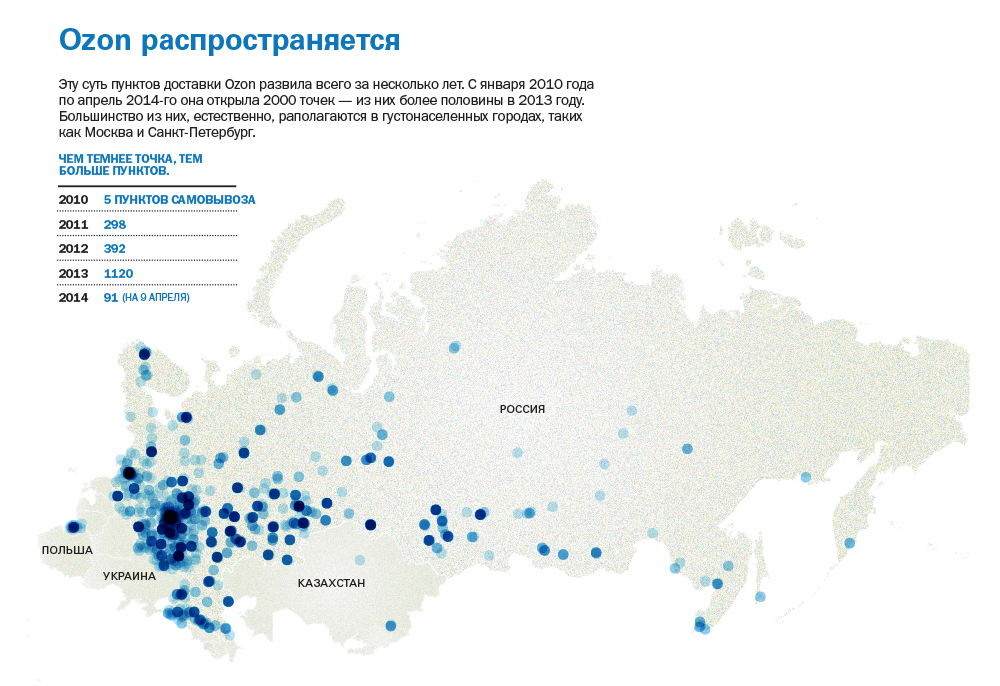 И все же своим успехом мы обязаны вовсе не копированию Amazon.Бизнес-среда России очень сильно отличается от американской или европейской. Когда я пришла в Ozon, здесь не было сколько-нибудь надежной инфраструктуры и никакие интернет-сервисы не помогут, если покупателю не вовремя доставили товар или не доставили вовсе. Когда мы начали предоставлять нашу площадку сторонним компаниям, те в 50% случаев не могли обеспечить своевременную доставку товара, поскольку работали через государственную почту — другого экспедитора попросту не было, по крайней мере в масштабе всей страны.