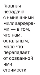 Главная незадача с нынешними миллиардерами — в том, что нам, остальным, мало что перепадает от созданной ими стоимости. Реальная заработная плата 62% американских трудящихся из категории производственного и неруководящего персонала с середины 1970-х снизилась. И с инвесторами миллиардеры не поделились по справедливости. До 1979 года десять лет подряд во всех отраслях рентабельность инвестированного капитала стабильно составляла около 5%, в 1979-м достигла максимума и с тех пор постоянно снижается. Сейчас она уже меньше 2% и на этом не остановится, а тем временем хранители капитала в лице руководителей корпораций и управляющих инвестициями вытягивают из нее в качестве платы за свои услуги все больше и больше.