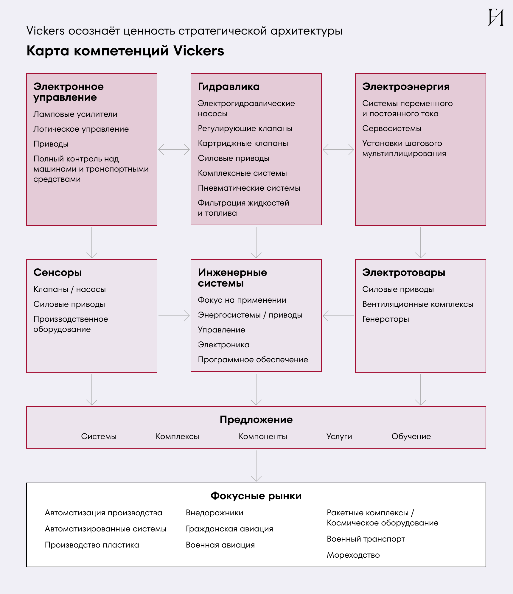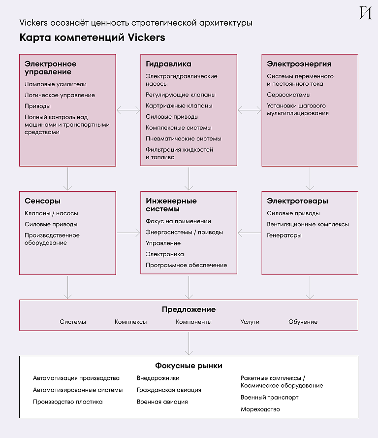 Несмотря на давление, связанное с получением краткосрочной прибыли, высшее руководство компании ориентировалось на 10—15-летний горизонт при разработке карты возникающих потребностей клиентов, меняющихся технологий и ключевых компетенций, необходимых для преодоления разрыва между ними. Девиз компании — «В XXI век». (Здесь представлена упрощенная версия разработанной архитектуры.) В настоящее время Vickers занимается разработкой компонентов для гидравлических систем. Архитектура выделяет две дополнительные компетенции: компоненты для электропитания и электронные системы управления. Также планировалось разработать функцию системной интеграции, объединяющую аппаратное обеспечение, программное обеспечение и услуги.