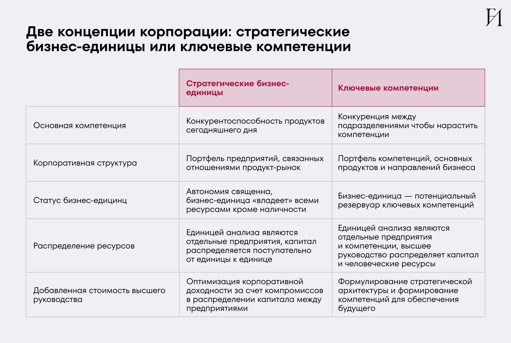 Новые условия конкурентной борьбы невозможно понять с помощью аналитических инструментов, разработанных для управления диверсифицированной корпорацией 20 лет назад, когда конкуренция была преимущественно внутренней (GE против Westinghouse, General Motors против Ford), а все ключевые игроки говорили на языке одних и тех же бизнес-школ и консалтинговых компаний. Старые рецепты имеют потенциально смертельные побочные эффекты. Необходимость новых принципов наиболее очевидна в компаниях, организованных исключительно по логике стратегических бизнес-единиц (SBU). Последствия двух альтернативных концепций корпорации обобщены в разделе «Две концепции корпорации: стратегические бизнес-единицы или ключевые компетенции».