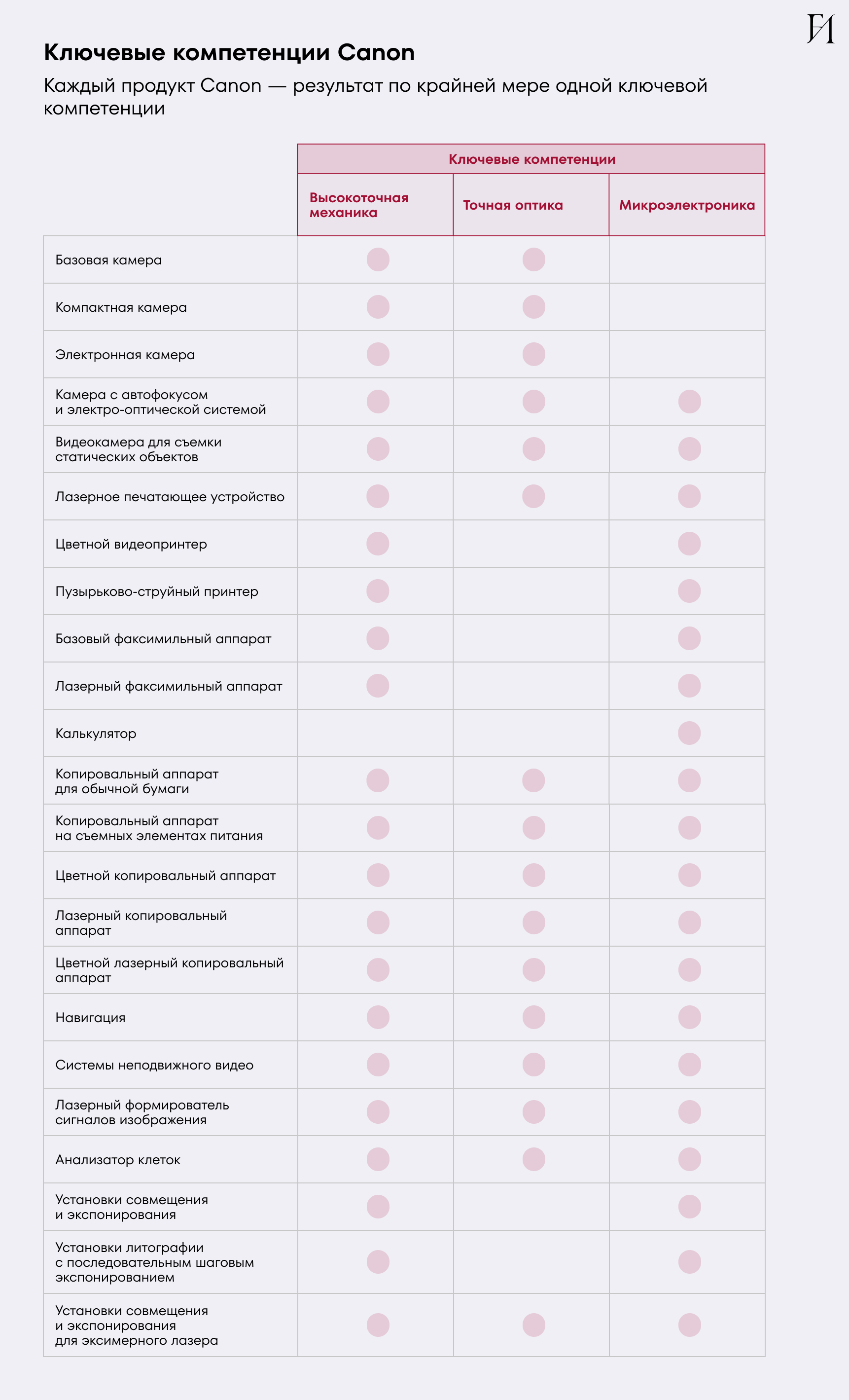 Элементы ключевой компетенции Canon в области оптики можно встретить в самых разных областях, таких как производство фотоаппаратов, копировальных аппаратов и полупроводникового литографического оборудования, они представлены в разделе «Ключевые компетенции Canon». Когда Canon обнаружила возможность работы в сфере цифровых лазерных принтеров, она предоставила руководителям бизнес-единиц право привлекать другие подразделения для привлечения необходимого кадрового резерва. Когда подразделение Canon, занимающееся репрографической продукцией, взялось за разработку копировальных аппаратов с микропроцессорным управлением, оно обратилось к подразделению фотопродукции, которое разработало первую в мире камеру с микропроцессорным управлением.