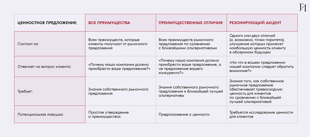 Этот тип предложения существенно отличается от предложения с преимущественными точками отличия по двум соображениям. Во-первых, больше не значит лучше. Хотя предложение поставщика может обладать несколькими выгодными точками отличия, предложение с резонирующим акцентом неизменно концентрируется на предоставлении одного или двух отличий, которые будут улучшаться в будущем, таким образом предоставив наибольшую ценность для целевых клиентов. Чтобы лучше использовать ограниченные ресурсы, поставщик может даже уступить ближайшей лучшей альтернативе выгодные точки отличия, которые клиенты ценят меньше всего, чтобы поставщик мог сосредоточить свои ресурсы на улучшении одной или двух точек отличия, которые клиенты ценят больше всего. Во-вторых, предложение с резонирующим акцентом может содержать точку паритета. Это происходит либо когда точка паритета требуется для того, чтобы целевые клиенты хотя бы рассмотрели предложение поставщика, либо когда поставщик хочет опровергнуть ошибочное восприятие клиентов, что конкретный элемент ценности является точкой отличия в пользу предложения конкурента. Последнее возникает, когда клиенты считают, что предложение конкурента лучше, а поставщик считает, что его предложение сопоставимо — исследование ценности для клиентов предоставит эмпирическую поддержку утверждению поставщика.