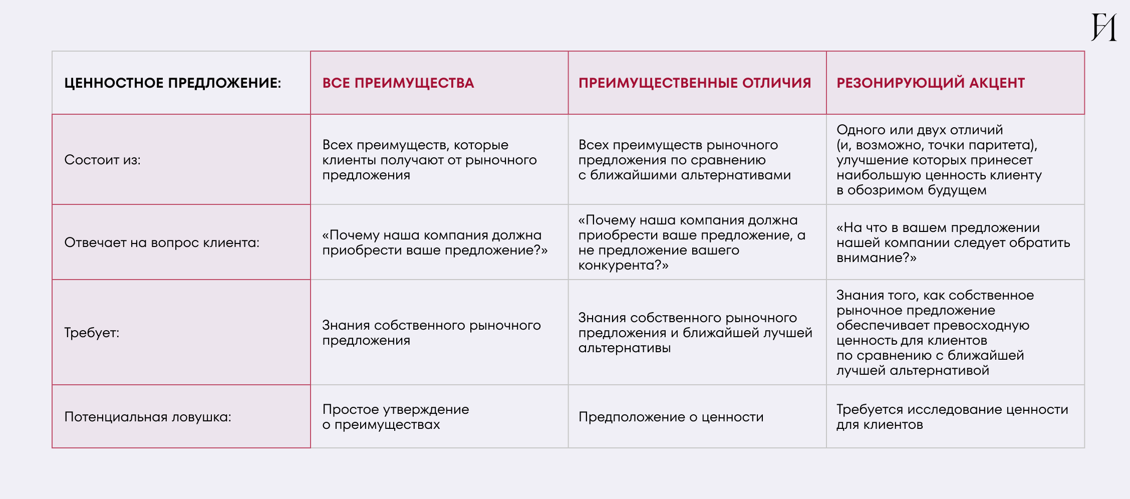 Поставщики используют термин «ценностное предложение» тремя разными способами. Большинство менеджеров просто перечисляют все преимущества, которые, по их мнению, их предложение может предоставить целевым клиентам. Чем больше смогут придумать, тем лучше. Некоторые менеджеры понимают, что у клиента есть альтернатива, но часто совершают ошибку, предполагая, что выгодные отличия должны быть ценными для клиента. Поставщики, применяющие передовой опыт, основывают свое ценностное предложение на нескольких параметрах, наиболее важных для целевых клиентов, демонстрируют ценность этого превосходного предложения и преподносят его таким образом, чтобы передать глубокое понимание приоритетов клиента.