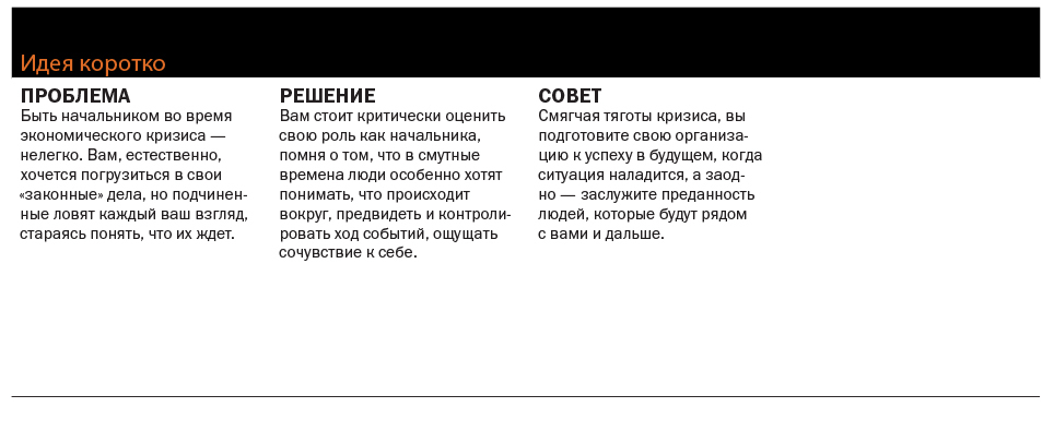 Сейчас несладко приходится всем начальникам. Страх и панические настроения воцарились не только на финансовых рынках, но и на рабочих местах. Несколько недель назад руководитель фирмы, оказывающей профессиональные услуги, рассказывал мне, как это было ужасно — уволить 10% сотрудников и чего ему стоило утешать и подбадривать оставшихся. Тогда я попросил нашего общего знакомого, директора производственной компании, морально поддержать страдальца и вытащить его из депрессии, и тот бросился на помощь. Но прежде признался, что и у него все не слава богу: он тоже едва оправился после проведенного 20-процентного сокращения персонала. То, что они оба оказались в одном и том же непростом положении, — неслучайно. Беда мало кого обошла стороной. Даже на предприятиях, славящихся своей человечностью, начальникам приходится резать по живому. В рейтинге Fortune за 2009 год NetApp (Network Appliances) заняла первое место в категории «Лучшее место работы». А уже спустя месяц после оглашения результатов рейтинга компания объявила, что сокращает 6% сотрудников. Google, у которой, согласно Fortune, был самый высокий рейтинг в 2008 году, пришлось расстаться с сотнями своих специалистов. Да, начальникам сейчас не позавидуешь, и не только потому, что им приходится выставлять людей на улицу. Там, где еще никого не уволили, все так или иначе этого ждут, а постоянный страх не может не травмировать. Один гендиректор ИТ-компании, понимая это, письменно уведомил персонал, что фирма не только не планирует никаких увольнений, но и намерена на будущий год принять много новых сотрудников. И вот что он говорит: «Как бы я ни расписывал наше прекрасное положение, меня все равно спрашивают: когда начнутся сокращения?». Допустим, за место можно не бояться, но и прочие неприятности — уменьшение зарплат и премий, сокращение бюджета, закрытие проектов — многие воспринимают очень болезненно. В результате начальники — и вы, быть может, в их числе — вдруг оказываются в ситуации, к которой они совершенно не готовы. Все, что они знают и умеют, накапливалось и совершенствовалось в годы экономического роста. Дальнейшее же зависит от ответа на один непредвиденный вопрос: как управлять людьми, когда все вокруг заражены страхом, когда вовсю бушует ураган, а впереди — километры сплошных ухабов? На такую работу управленцы в большинстве своем не подписывались, и не все из них окажутся на высоте. Эта статья адресована тем, кто хочет проявить себя с лучшей стороны в непростой ситуации. Прежде всего, она помогает понять, почему так трудно быть хорошим начальником; кроме того, она объясняет, что именно делают лучшие из руководителей в трудные времена.