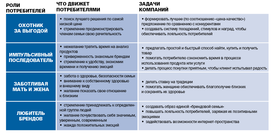 Чтобы выявить мотивы, движущие российскими потребителями при поиске, выборе и покупке товаров и услуг, Высшая школа маркетинга и развития бизнеса НИУ ВШЭ провела исследование по заказу финского Агентства финансирования технологий и инноваций «Tekes». Рассмотрев способы взаимодействия с клиентами 19 российских и международных компаний, работающих в России, исследователи выделили восемь основных моделей поведения, или ролей, отечественных потребителей. Кроме того, они изучили, как бизнес отвечает на запросы разных покупателей и сформулировали задачи, которые компании могут поставить перед собой, чтобы удовлетворять потребности клиентов (см. таблицу).