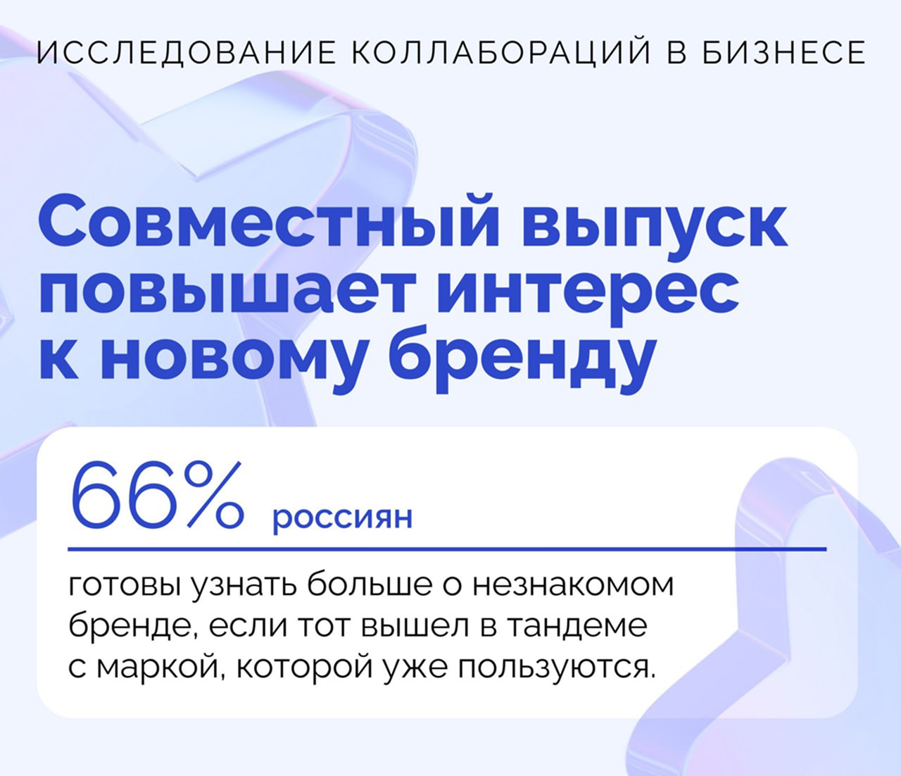 Более 60% опрошенных готовы попробовать продукт или сервис от нового для себя бренда, если тот сделал коллаборацию с кем-то известным. И порядка 50% — говорит о том, что будут чаще пользоваться привычной для них маркой, если та сделает коллаборацию.