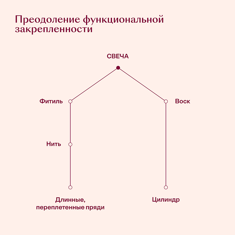 Один из способов преодолеть эту проблему — изменить то, как вы описываете объект. Например, если сказать, что свечной фитиль — это нить, почти каждый поймет, что его можно использовать для связывания вещей. Наша «техника общих частей» (generic parts technique) — это систематический подход к описанию объекта, который позволяет избежать непреднамеренного сужения представлений о нем и открыть путь к большему количеству идей.