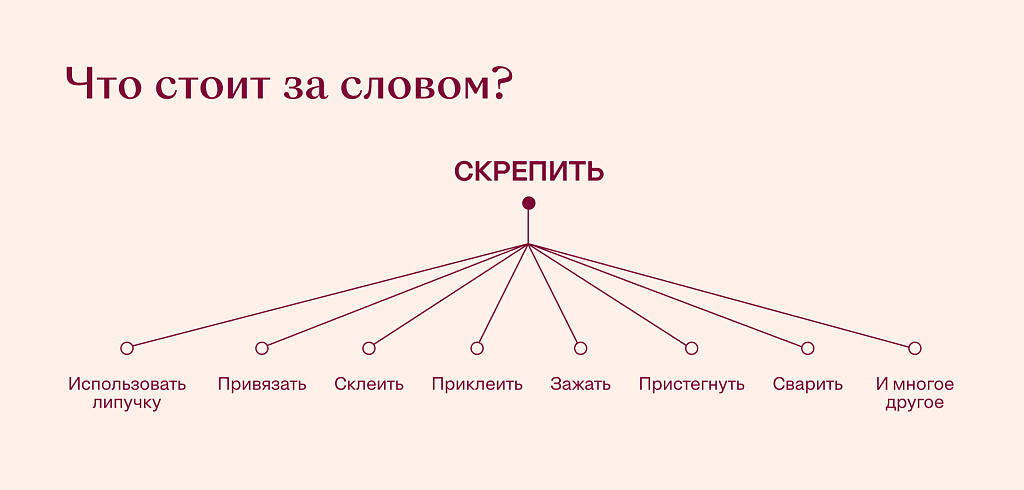 Но бывает сложно определить, что считать «более общим термином». Является ли «скрепить» более общим, чем «приклеить»? Хороший ресурс для проверки — тезаурус, который делает иерархическую структуру явной через гипонимы (более конкретные синонимы). Например, онлайн-тезаурус WordNet (лексическая база данных английского языка, разработанная в Принстонском университете, которая функционирует как семантическая сеть. — Прим. ред.) указывает, что существует по меньшей мере 61 способ скрепить вещи — включая сшить, зажать, приковать, подвязать, пристегнуть, зацепить, опоясать, привинтить, склепать. Каждый из этих терминов по-своему описывает процесс скрепления одного предмета с другим и предполагает разные решения. У глагола adhere, напротив, всего четыре гипонима.