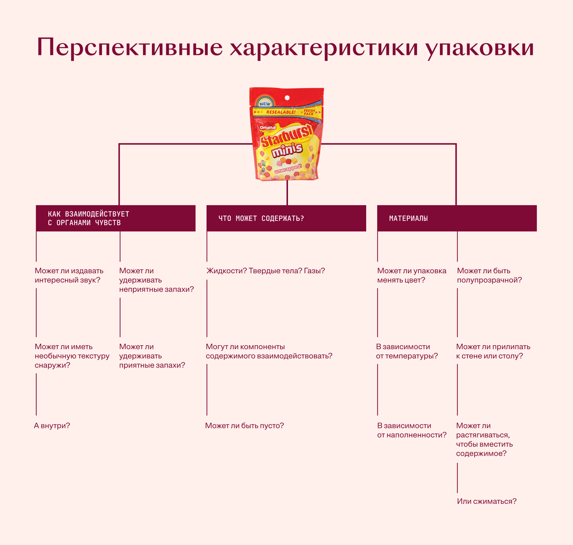 Почему? Когда людям дают продукт и просят создать новый дизайн или его вариацию, они склонны фиксироваться на характеристиках текущей версии. Это препятствие для новизны называется фиксацией на дизайне (design fixation). Возьмем пример из реального мира: когда людям показывают прочный закрывающийся пакет, полный конфет, и просят придумать новый дизайн, они склонны манипулировать характеристиками текущей версии — фокусируются на ширине основания пакета или жесткости пластика, позволяющей ему стоять. Однако, чтобы по-настоящему проявить новаторский подход, вам нужно манипулировать теми характеристиками, которые все остальные упустили из виду.