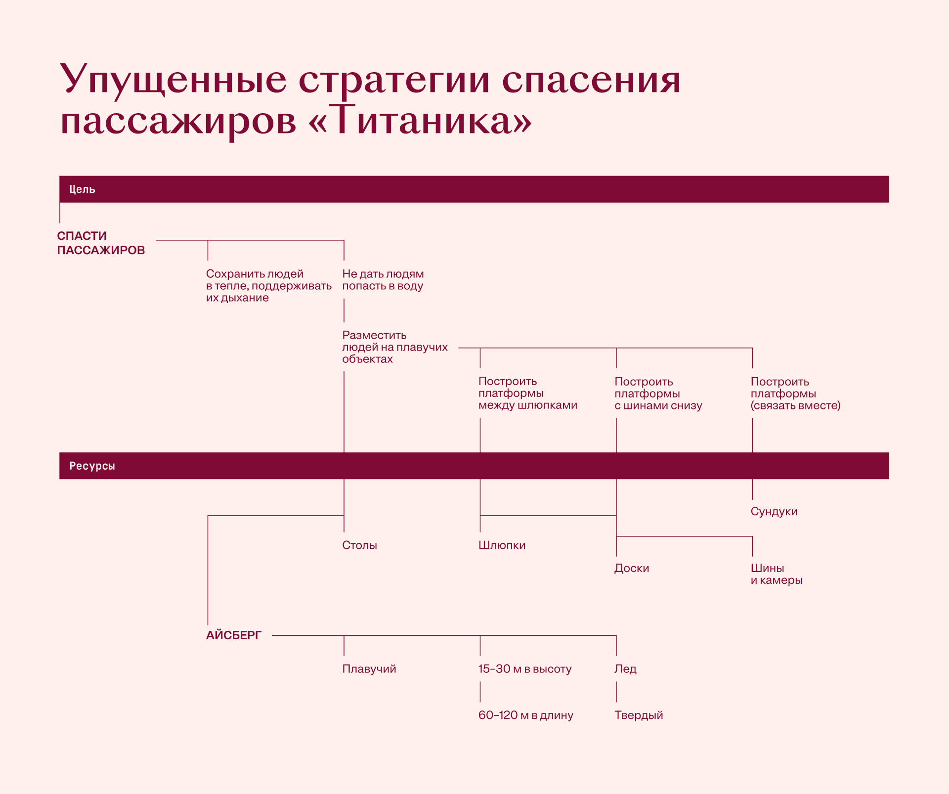 Чтобы лучше понять механику, вернемся к проблеме пассажиров «Титаника». Начнем с цели «спасти пассажиров». Самые очевидные ресурсы — спасательные шлюпки. Простейшее применение ресурсов для достижения цели — «посадить людей в шлюпки». Так мы получаем прямую линию.