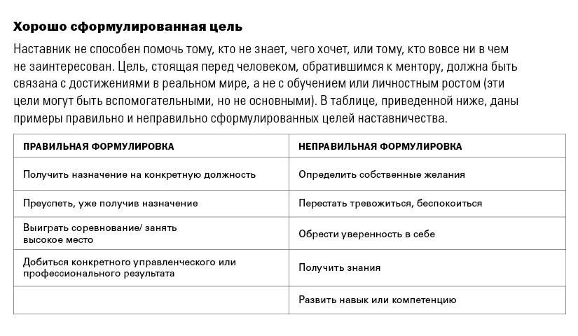 Хорошие наставники внушают подопечным уверенность в себе. Они способны помочь им оценить собственные возможности и грамотно расставить приоритеты. Они делятся знаниями и опытом, помогают отработать необходимые навыки или наладить отношения с коллегами. Однако все это трудно или невозможно сделать, если у человека, обратившегося за менторской помощью, нет четкого представления о том, какой результат он планирует получить, для чего хочет развиваться или чего надеется достичь, когда приобретет дополнительные знания и умения.