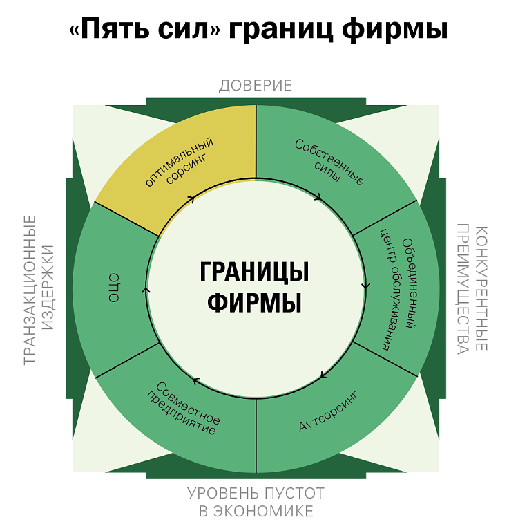 Наконец, это сами границы фирмы, которые не являются незыблемыми, а постоянно меняются под воздействием четырех сил: конкуренции, транзакционных издержек, доверия и институциональных пустот.